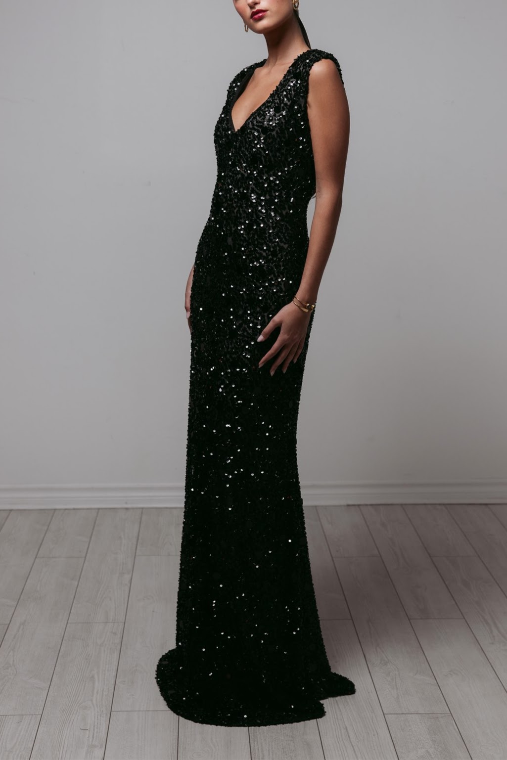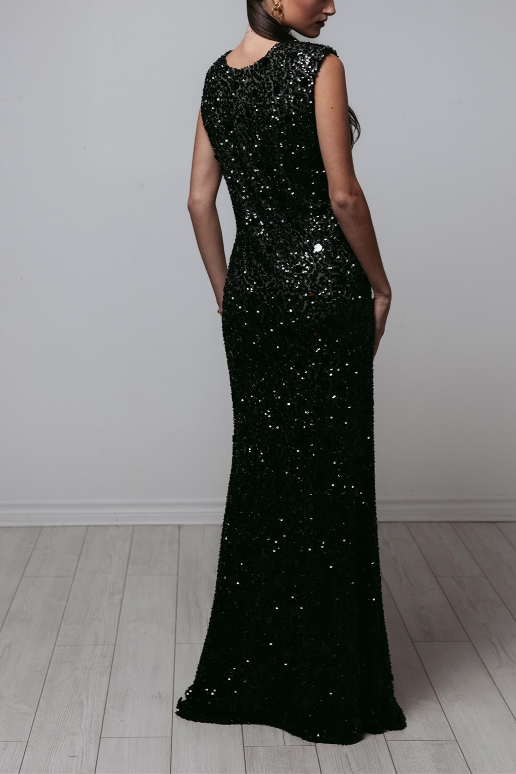 This embellished sequined tulle gown is drenched in black sequin that catch the light beautifully from all angles . The fabric is from fitting with a generous amount of spandex , ensuring a smooth, body-hugging fit that moves comfortably with you . Elegant, bold and prefect for any evening event .