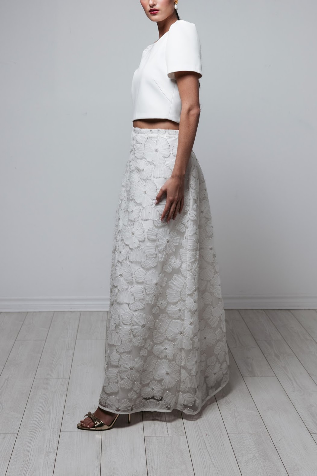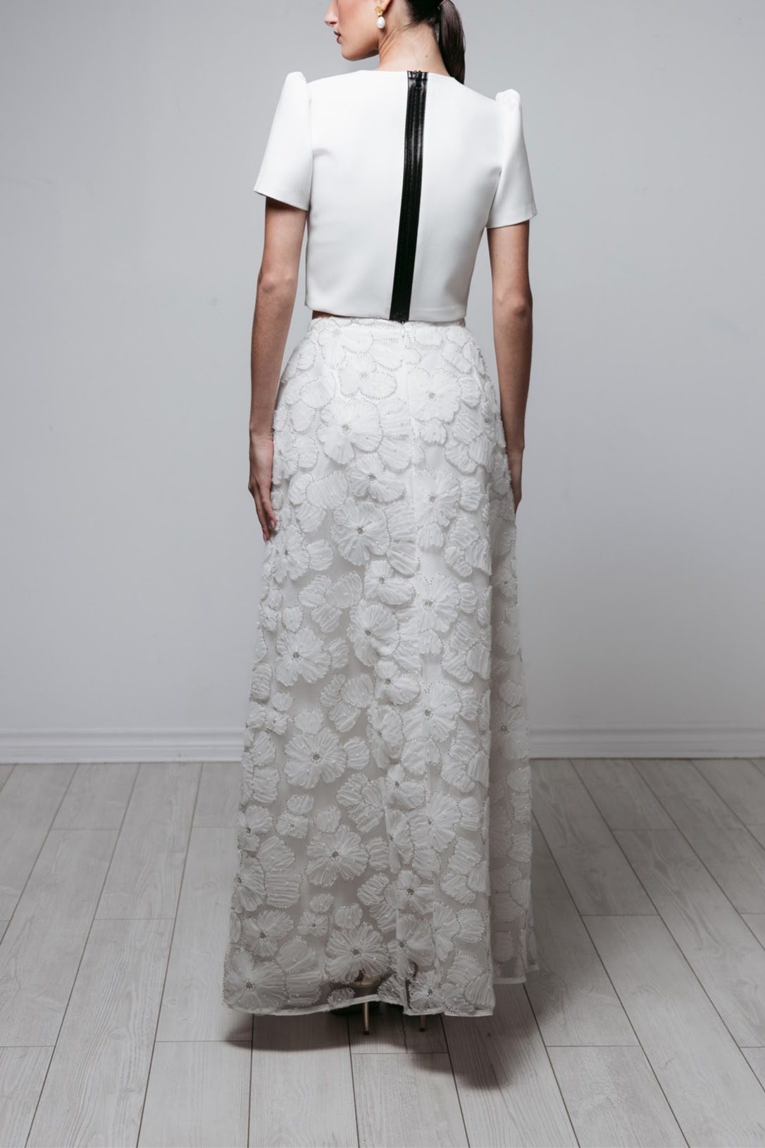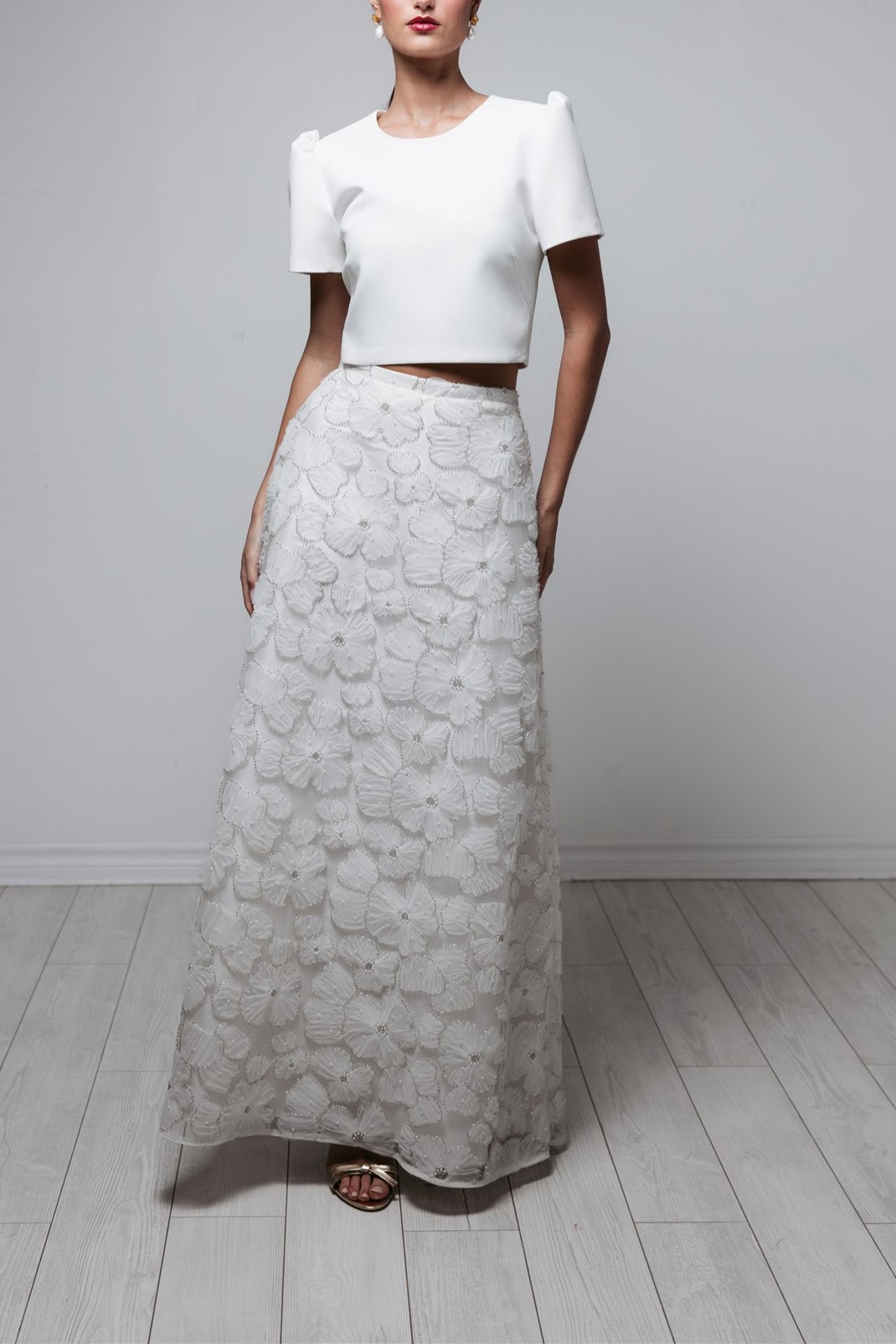 This elegant maxi skirt is crafted from a beautifully textured lace fabric featuring circular, pearl-like motifs that create soft dimension and movement . Cut to sit high on the waist, it falls into a long ,fluid silhouette .The lightweight structure gives it a romantic finish, while the clean waistband and smooth lining ensure a comfortable ,flattering fit . Perfect for special occasions , evening events , or modern bridal looks .