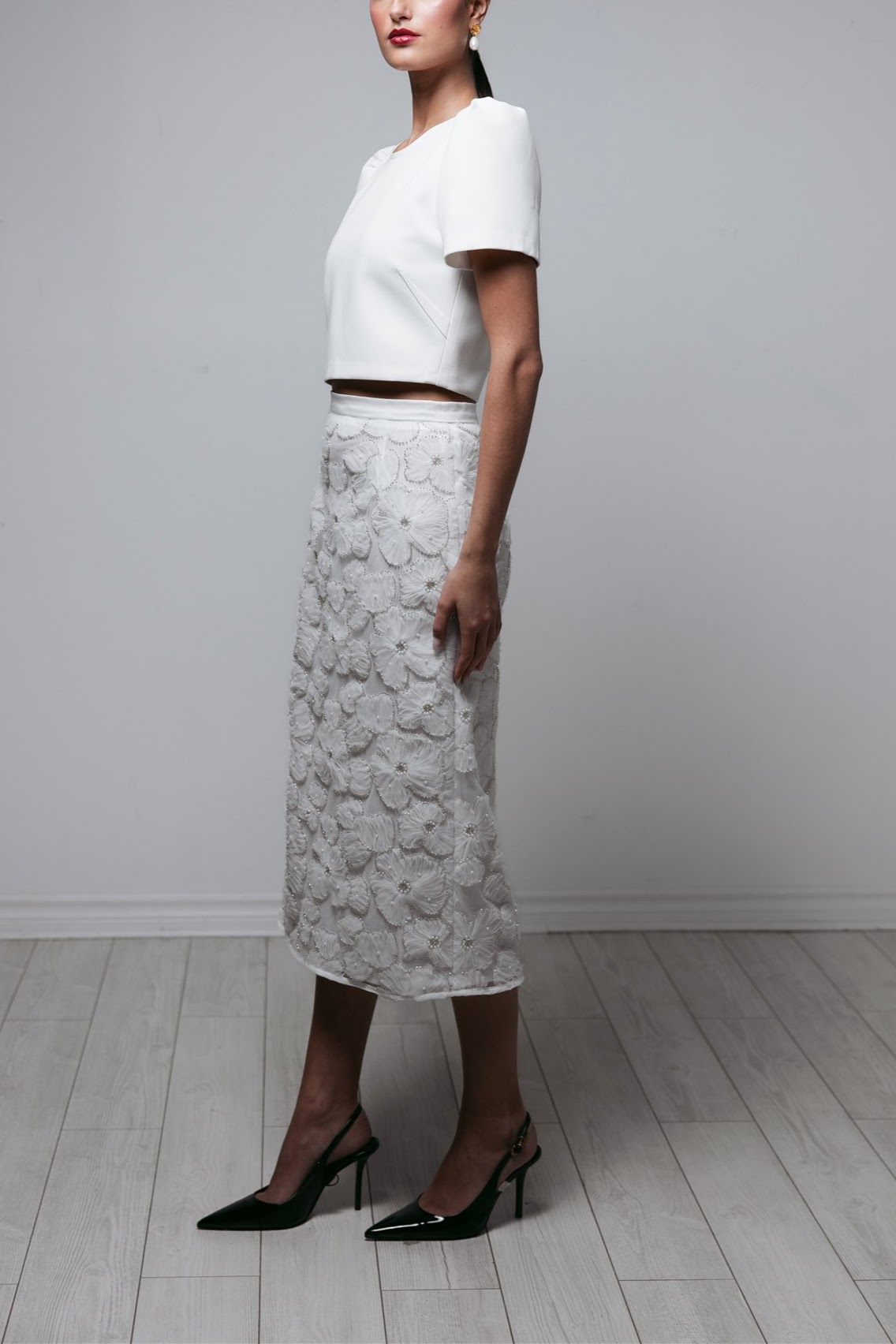 This elegant pencil skirt is crafted from beautifully textured lace fabric featuring circular , pearl-like motifs that create soft dimension. Perfect for special occasions, evening events , or modern bridal looks.