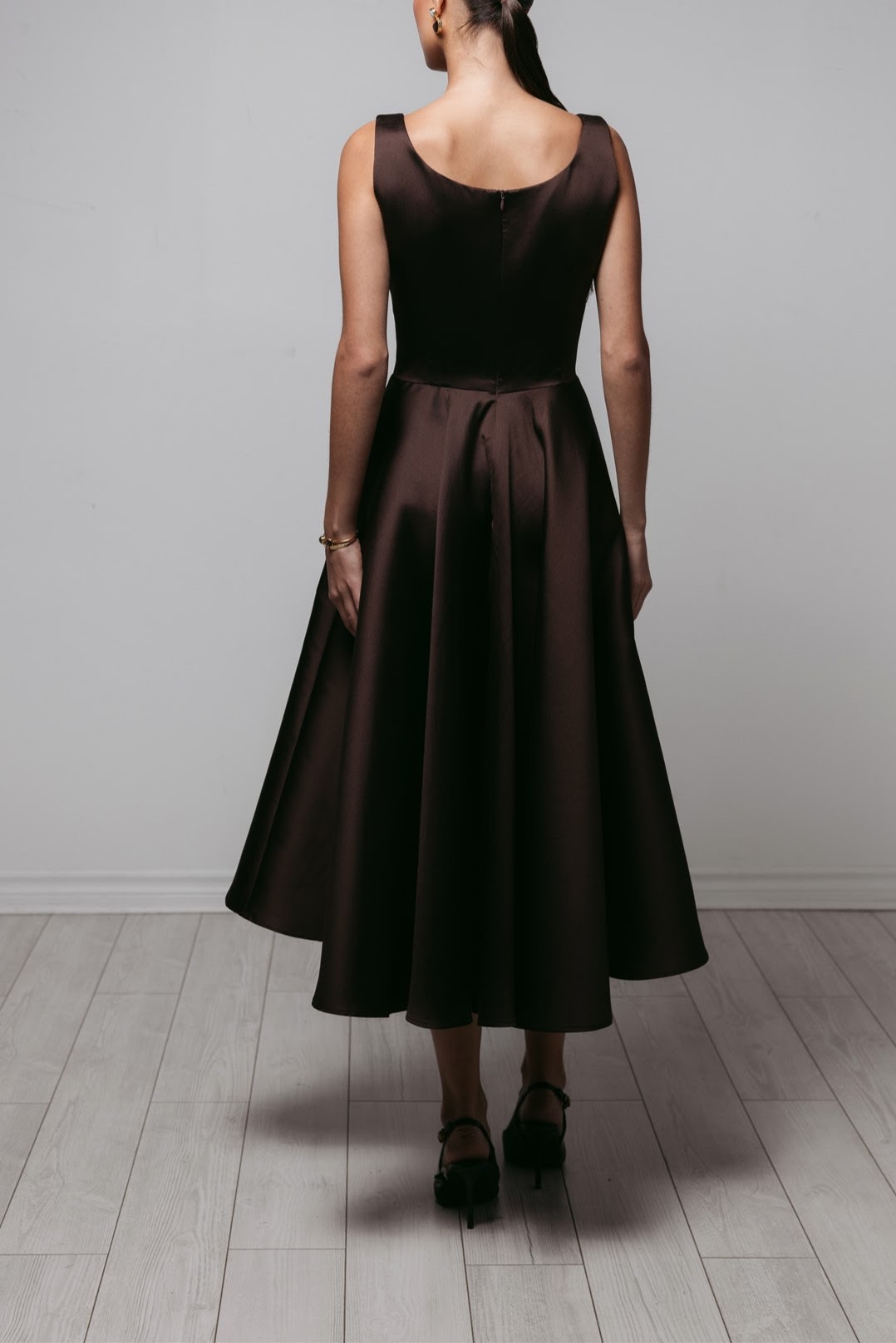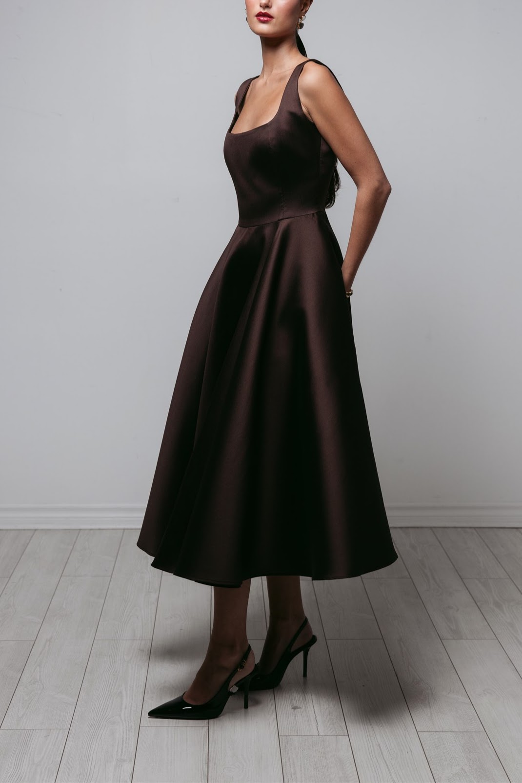 This 100% Silk dress is crafted from structured silk that drapes with beautiful volume. Designed with a clean square neckline and wide straps, the bodice is fitted and seamlessly flows into a full, midi-length circle skirt . Its sculptural shape gives it a timeless, couture-inspired feel perfect for cocktail events or modern evening occasion.