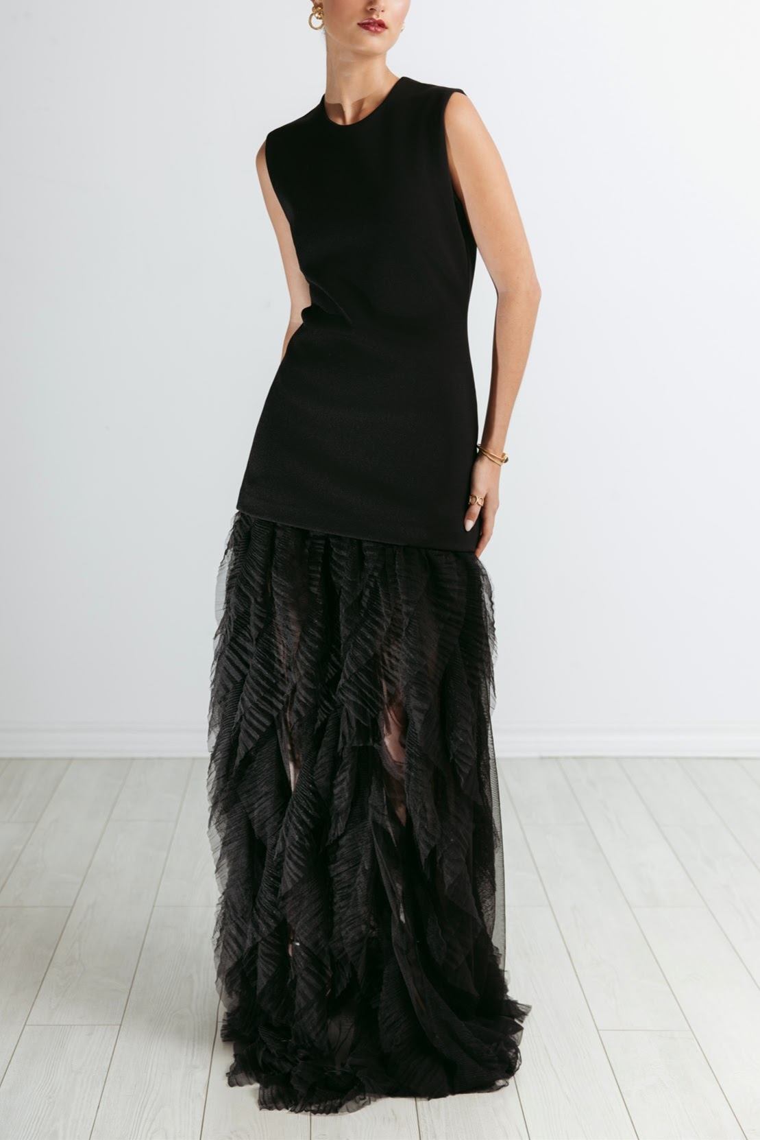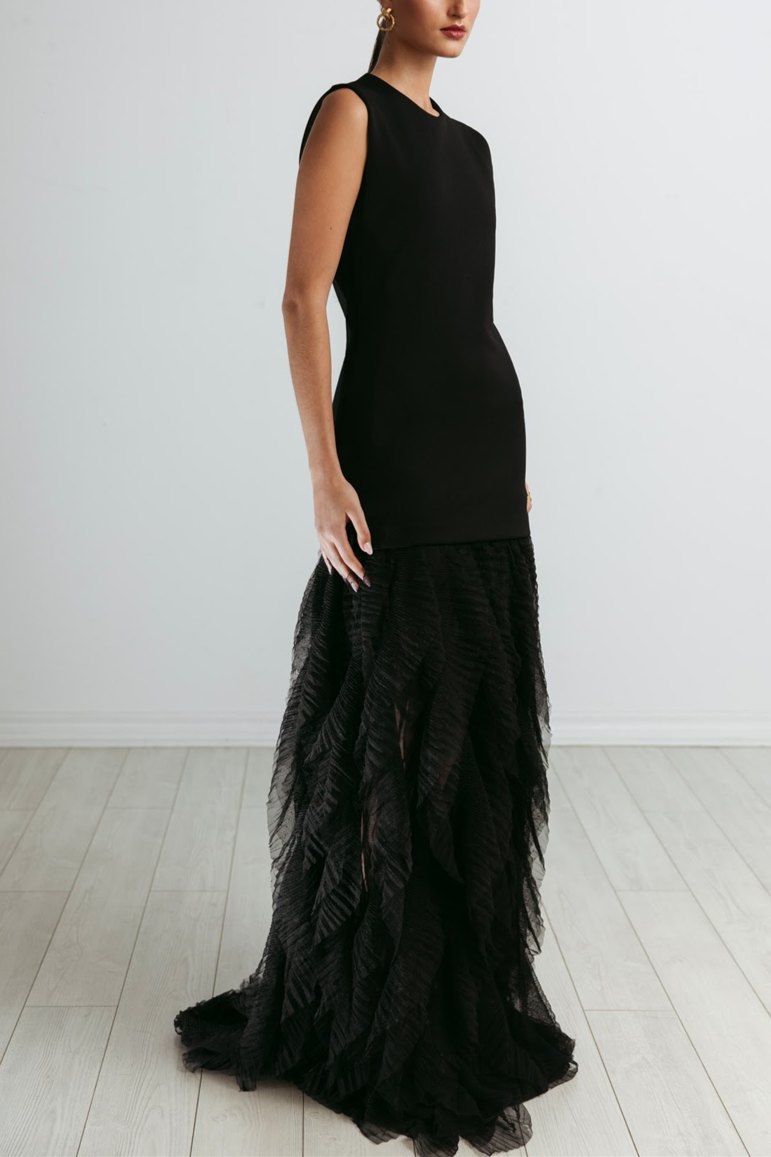 A refined Black gown featuring a smooth, stretchy knit bodice that extends into a clean drop-waist design. From the waist down , the dress transforms into a dramatic ,layered tulle skirt, crafted with textured tulle panels that create soft movement and depth. Striking , modern , and perfect for evening occasions.